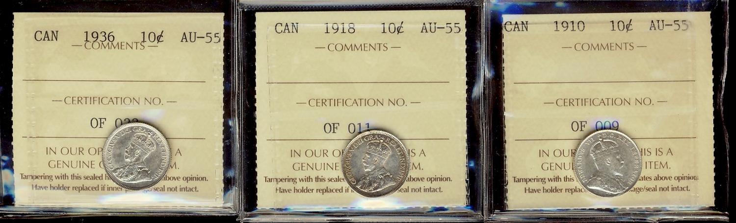 1910, 1918, 1936, 10¢ all ICCS AU55, Lot of 3 coins,