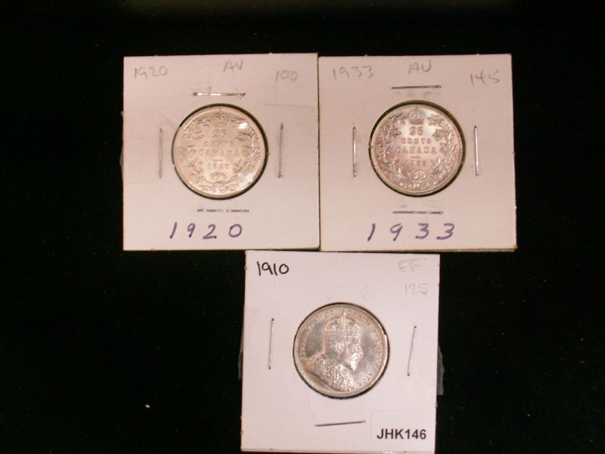 1910, 1920 & 1933 25¢ EF/EF++. Lot of 3 coins.