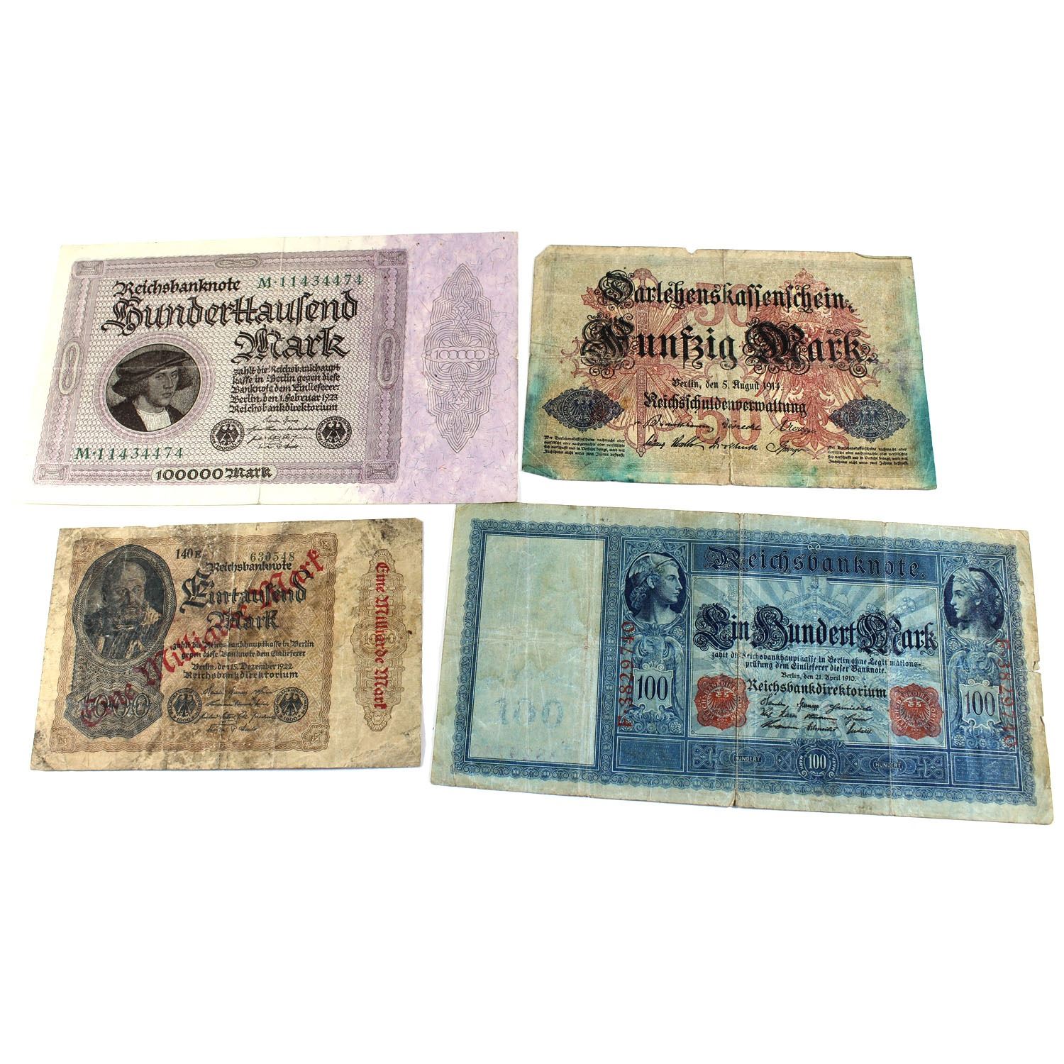 1910-1923 Germany Banknotes in Fine or Very Fine - Pick #42 1910 100 Mark , Pick #49b 1914 59 Mark, Pick #113b 1922 1 Billion Mark & Pick #83a 1923 100, 000 Mark. Notes contain various impairments. 4pcs