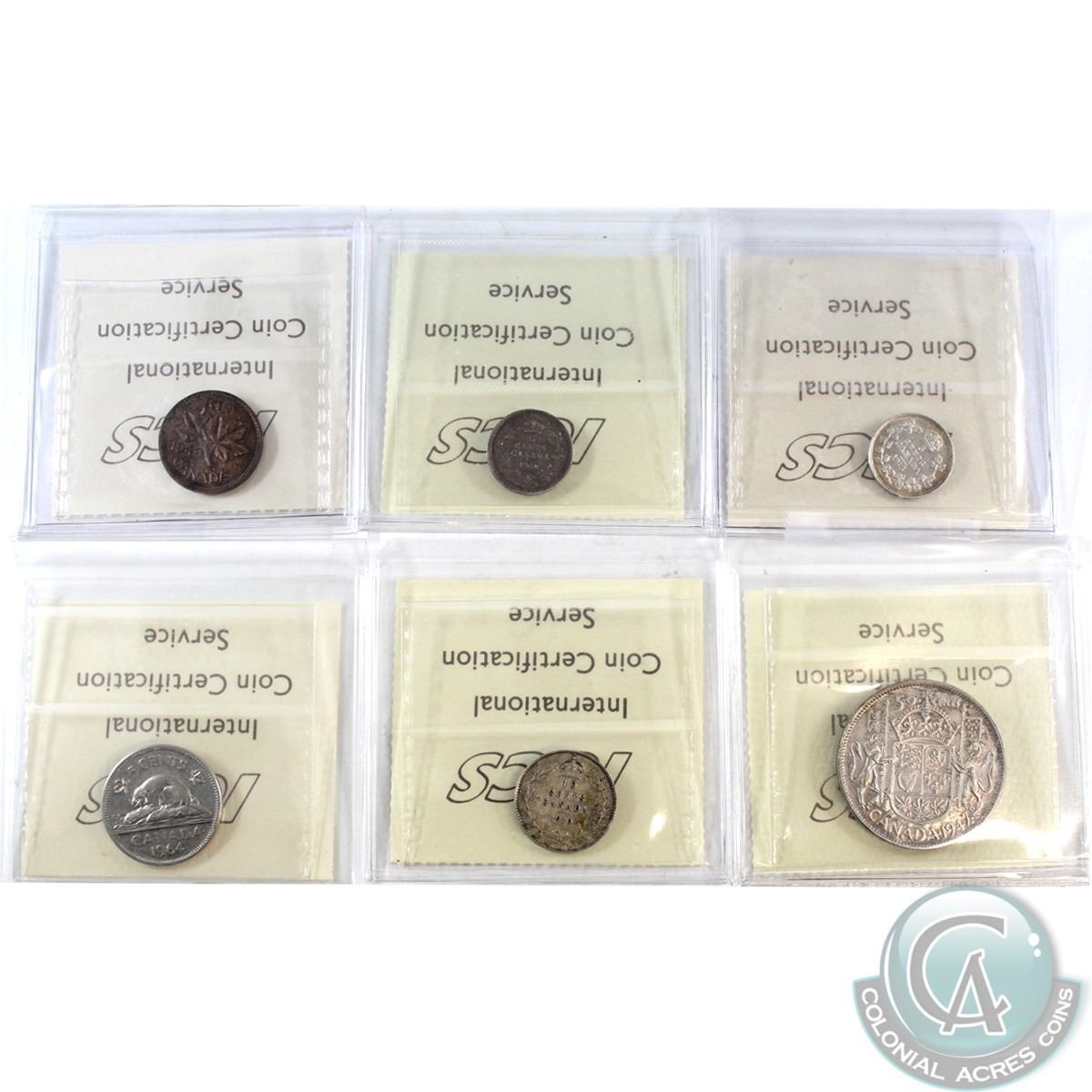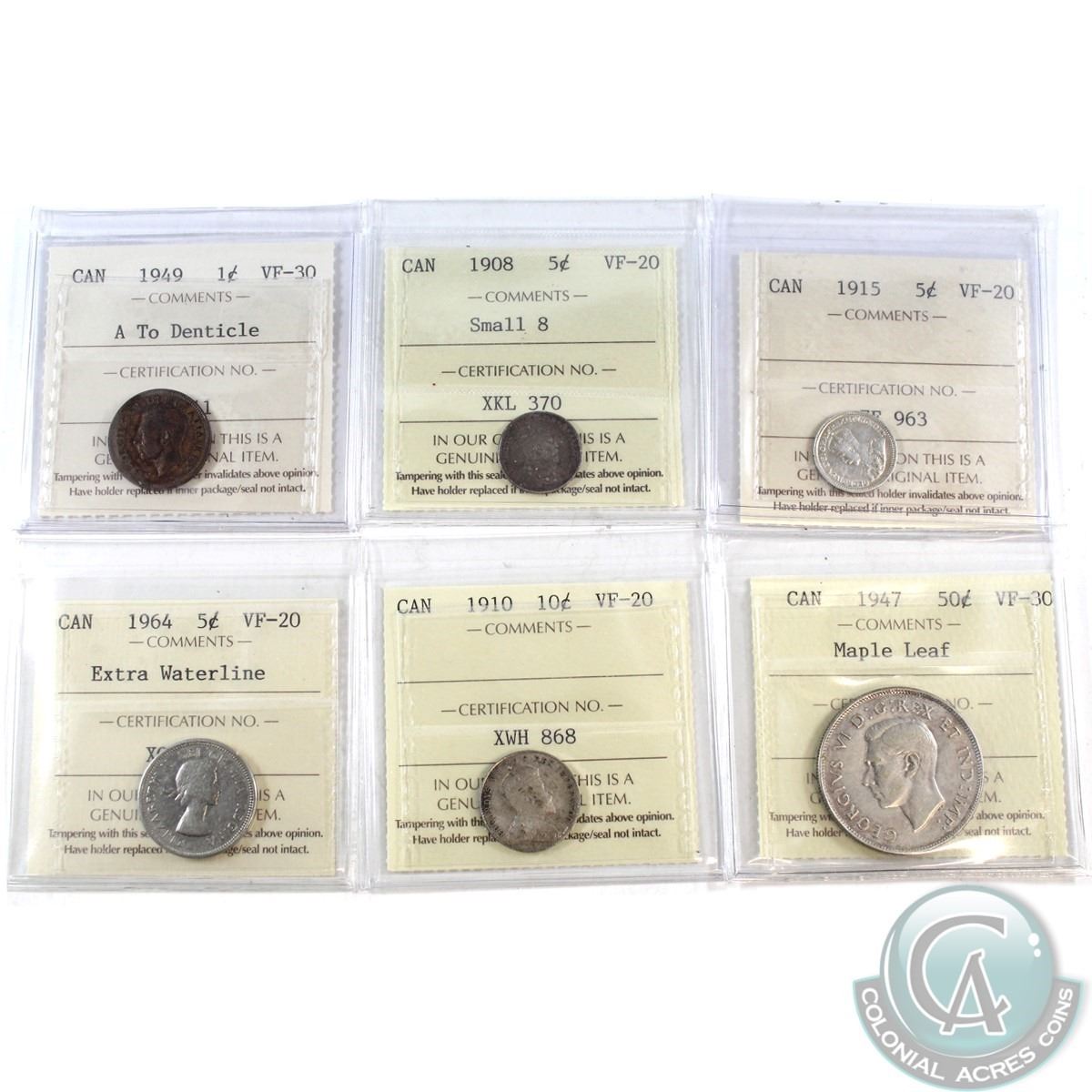 1910-1965 Canada ICCS Certified coins: 1949 1-cent A to Denticle VF-30, 1908 Small 8 5-cent VF-20, 1915 5-cent VF-20, 1964 Extra Waterline VF-20, 1910 10-cent VF-20 & 1947 Maple Leaf 50-cent VF-30. 6pcs