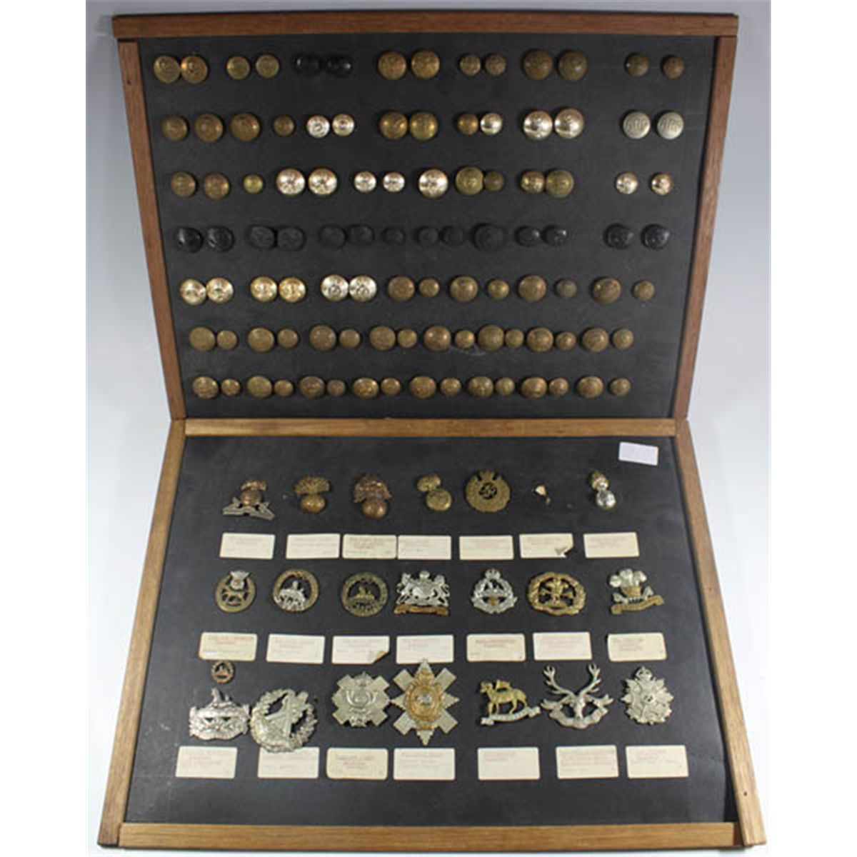 Badges including, The Pembroke Yeomanry, Lancashire Fusiliers, Border Regiment, Seaforth Highlanders, Royal Air Force, Canadian Expeditionary Force, Army Territorial Service, Royal New Zealand Air Force, Officer Training Corps, etc. Buttons including, Dorsetshire Regiment, Royal Ulster Constabulary, Royal Irish Regiment, Air Raids Precautions, Devonshire Regiment, The King's Regiment etc. includes some reproductions (383 items)