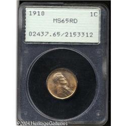 1910 1C MS65 Red PCGS. Well struck with light colo <B>1910 1C MS65 Red PCGS.</B></I> Well struck with light coloration and bright surfaces that reveal a few noticeable contact marks on the reverse, and a few small specks on obverse and reverse alike. Housed in a first-generation PCGS holder. <BR><BR><B>Important notice:</B> Heritage usually auctions material at the rate of 200-250 lots per hour. On some occasions eBay Live bid software or the Internet may not be able to keep up with the pace of the auction. We recommend placing a realistic absentee bid now as insurance to avoid disappointment. Occasionally the auctioneer may eliminate or reject an eBay Live bid, and the auctioneer may also reopen a lot after the close of the eBay live bidding (usually because we missed an audience bid), and may reject your bid even if it shows you as the winning bidder. By bidding via eBay Live, you agree that Heritage may award the lot to another bidder at its sole discretion under the circumstances described above or any other reasonable circumstances. Since eBay bids are not shown to us until we open the lot on the floor, we treat those bids just like floor bids. In most cases the floor responds before the eBay bid is presented to us, due to Internet lag time, so for consistency we have made it a policy that floor bids are always considered first over tie eBay live bids. Also please note that all Heritage lots purchased through eBay Live carry a 20% Buyer's Premium. Please make sure you read the Terms and Conditions before you bid. This lot is being auctioned in conjunction with a live floor auction by Heritage Galleries & Auctioneers. All final auction and invoice information will be supplied by Heritage Galleries & Auctioneers, and all other information should be considered preliminary. Lot:5218