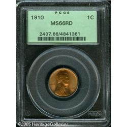 <B>1910 1C MS66 Red PCGS.</B></I> Fully struck with a glowing, bright red-orange color over abundant, satiny luster. There is also some gentle steel-gray toning on both sides, along with a small number of dark-green specks, on the obverse. Virtually unmarked on obverse and reverse alike. Lot:5391