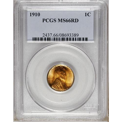 <B>1910<1C> MS66 Red PCGS.</B></I> The frosty luster on each side is bright and effulgent. Boldly struck with minor weakness on the beard and lower hair. Vivid red-orange and peripheral mint-green toning cements the eye appeal of this lovely cent. Only sixteen pieces have been graded finer by PCGS (8/06).