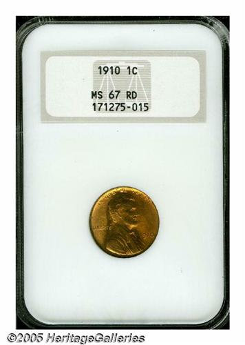 <B>1910<1C> MS67 Red NGC.</B></I> Sharply struck with brilliant red-orange patina and nearly mark-free surfaces. The reverse exhibits a little subtle spotting over ONE, but this is only visible at certain angles, and subtle clash marks reside directly behind Lincoln's head. Population: 14 in 67, 0 finer (3/05).