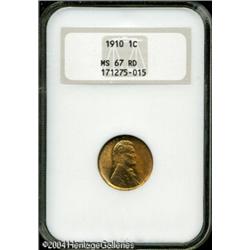 1910 1C MS67 Red NGC. Sharply struck with brillian <B>1910 1C MS67 Red NGC.</B></I> Sharply struck with brilliant red-orange patina and nearly mark-free surfaces. The reverse exhibits a little subtle spotting over ONE, but this is only visible at certain angles, and subtle clash marks (as struck) reside directly behind Lincoln's head. Population: 14 in 67, 0 finer (10/04). <BR><BR><B>Important notice:</B> Heritage usually auctions material at the rate of 200-250 lots per hour. On some occasions eBay Live bid software or the Internet may not be able to keep up with the pace of the auction. We recommend placing a realistic absentee bid now as insurance to avoid disappointment. Occasionally the auctioneer may eliminate or reject an eBay Live bid, and the auctioneer may also reopen a lot after the close of the eBay live bidding (usually because we missed an audience bid), and may reject your bid even if it shows you as the winning bidder. By bidding via eBay Live, you agree that Heritage may award the lot to another bidder at its sole discretion under the circumstances described above or any other reasonable circumstances. Since eBay bids are not shown to us until we open the lot on the floor, we treat those bids just like floor bids. In most cases the floor responds before the eBay bid is presented to us, due to Internet lag time, so for consistency we have made it a policy that floor bids are always considered first over tie eBay live bids. Also please note that all Heritage lots purchased through eBay Live carry a 20% Buyer's Premium. Please make sure you read the Terms and Conditions before you bid. This lot is being auctioned in conjunction with a live floor auction by Heritage Galleries & Auctioneers. All final auction and invoice information will be supplied by Heritage Galleries & Auctioneers, and all other information should be considered preliminary. Lot:5221