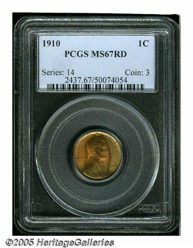 <B>1910<1C> MS67 Red PCGS.</B></I> A bold striking with vibrant, matte-textured surfaces that display a beautiful mix of orange-red and lime-golden patina at the borders. The '10-P Lincoln is hardly a scarcity in Mint State, but at this almost unimprovable grade level very few exist. Population: 16 in 67, 0 finer (6/05).<BR><I>From The William Bickel Collection, Part One.</B></I>