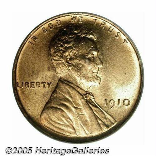<B>1910<1C> MS67 Red PCGS.</B></I> With more than 146 million coins produced, the second-year 1910 is an understandably common coin, at least in lower grades. As a fully lustrous Superb Gem, however, the '10-P is seldom offered. This is a simply gorgeous survivor whose frosty textured surfaces are bursting with golden-reddish luster. The color deepens ever so slightly on the reverse to golden-orange shades. Every feature is sharply struck. Population: 16 in 67 Red, there are none finer at either NGC or PCGS (3/05).<BR><I>From The Tom Mershon #2 All-Time PCGS Registry Set of Lincoln Wheat Cents.</B></I>