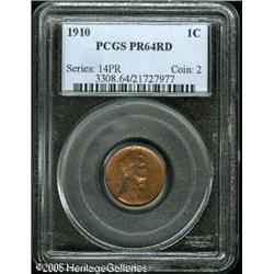 <B>1910 1C PR64 Red PCGS.</B></I> Sharply struck, with orange patina over lustrous surfaces. A couple of small flecks are noted on the lower reverse. Lot:5608