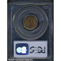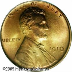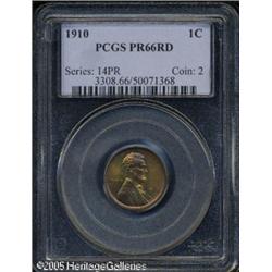 <B>1910 1C PR66 Red PCGS.</B></I> One could make the argument that this is not technically a full red coin, but the lime-green tendencies and blue accents on the obverse are well within the range of acceptability for a red copper proof. In fact, the iridescent qualities seen on the obverse enhance this coin's attractiveness and desirability considerably. The striking details shows pinpoint definition in all areas, and the surfaces are devoid of any mentionable contact marks, just a couple of small spots of carbon are present. Population: 18 in 66, 2 finer (1/05). Lot:5609
