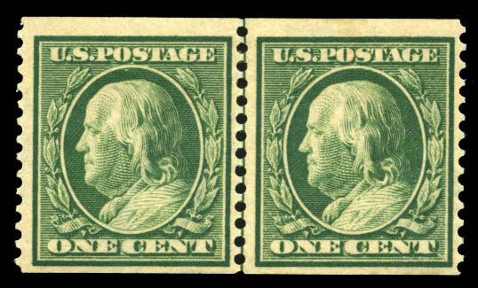 * 1910, 1¢ Green Coil. Line pair. O.g., hinged. Fine to Very Fine.