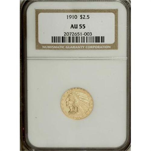 <B>1910 $2 1/2 AU55 NGC.</B></I> NGC Census: (54/5023). PCGS Population (230/2504). Mintage: 492,000. Numismedia Wsl. Price for NGC/PCGS coin in AU55: $218. (#7941)<BR><BR><b>Shipping:</b> Coins & Currency (<a target="_blank" href="http://www.heritageauctions.com/common/shipping.php">view shipping information</a>)