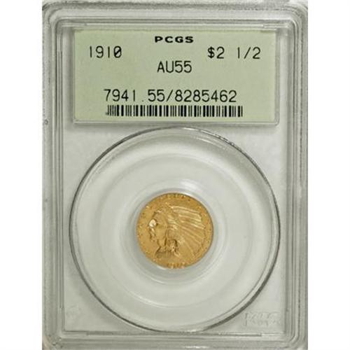 <B>1910 $2 1/2 AU55 PCGS.</B></I> PCGS Population (237/2611). NGC Census: (61/5297). Mintage: 492,000. Numismedia Wsl. Price for NGC/PCGS coin in AU55: $224. (#7941)<BR><BR><B>Coin Engraver:</B> Bela Lyon Pratt<BR><BR><b>Shipping:</b> Coins & Currency (<a target="_blank" href="http://www.heritageauctions.com/common/shipping.php">view shipping information</a>)