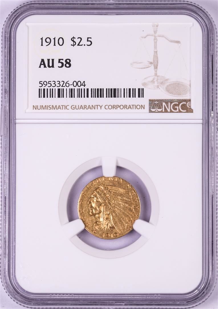 One 1910 $2 1/2 Indian Head Quarter Eagle Gold Coin NGC AU58. NGC Certified.
