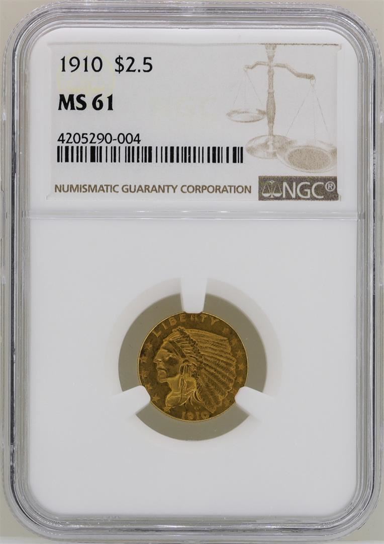 One 1910 $2 1/2 Indian Head Quarter Eagle Gold Coin NGC MS61. NGC Certified.