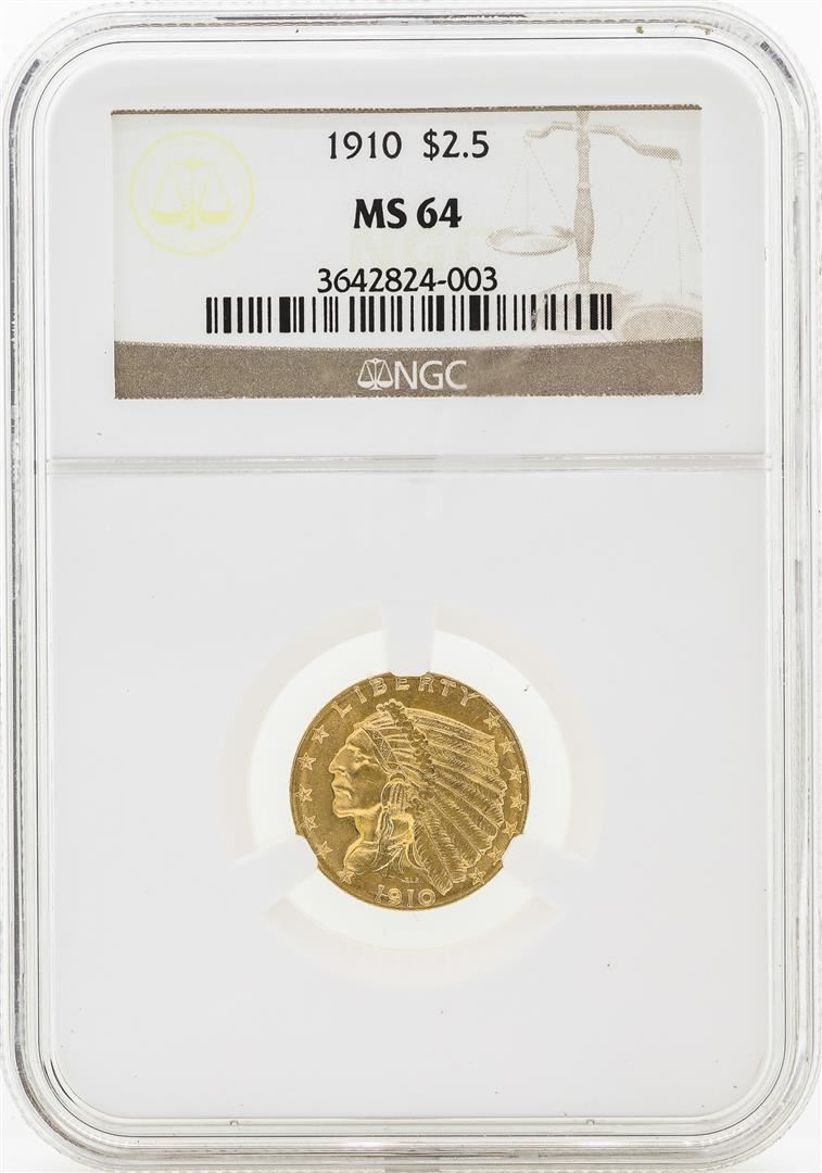One 1910 $2 1/2 Indian Head Quarter Eagle Gold Coin NGC MS64. NGC Certified.