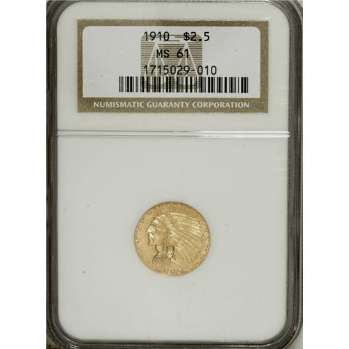 <B>1910 $2 1/2 MS61 NGC.</B></I> NGC Census: (1066/3239). PCGS Population (317/1601). Mintage: 492,000. Numismedia Wsl. Price: $332. (#7941)<BR><BR><b>Shipping:</b> Coins & Currency (<a target="_blank" href="http://www.heritageauctions.com/common/shipping.php">view shipping information</a>)
