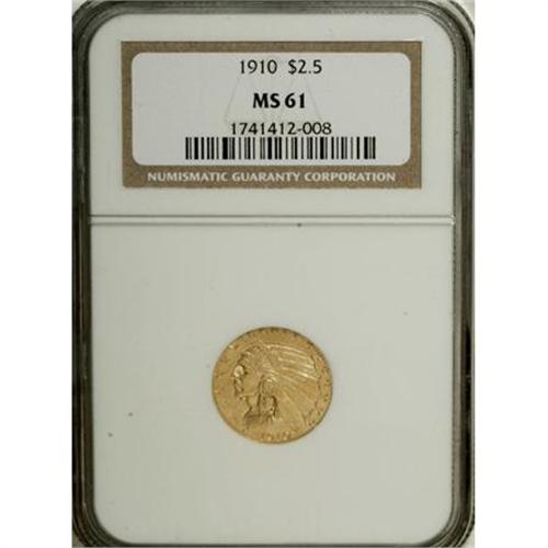 <B>1910 $2 1/2 MS61 NGC.</B></I> NGC Census: (1078/3308). PCGS Population (318/1606). Mintage: 492,000. Numismedia Wsl. Price for NGC/PCGS coin in MS61: $305. (#7941)<BR><BR><b>Shipping:</b> Coins & Currency (<a target="_blank" href="http://www.heritageauctions.com/common/shipping.php">view shipping information</a>)