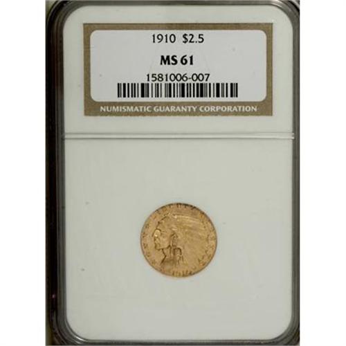 <B>1910 $2 1/2 MS61 NGC.</B></I> NGC Census: (1114/3394). PCGS Population (319/1658). Mintage: 492,000. Numismedia Wsl. Price for NGC/PCGS coin in MS61: $315. (#7941)<BR><BR><B>Coin Engraver:</B> Bela Lyon Pratt<BR><BR><b>Shipping:</b> Coins & Currency (<a target="_blank" href="http://www.heritageauctions.com/common/shipping.php">view shipping information</a>)