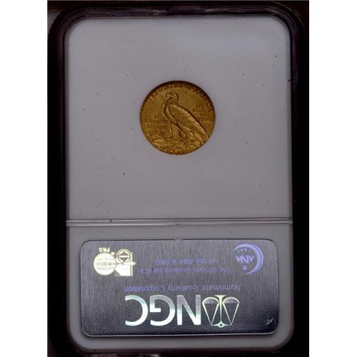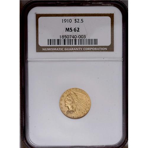 <B>1910<$2 1/2> MS62 NGC.</B></I> A lustrous and well struck yellow-gold example with few marks for the grade. A tiny copper spot on the Indian's bonnet has toned darkly.