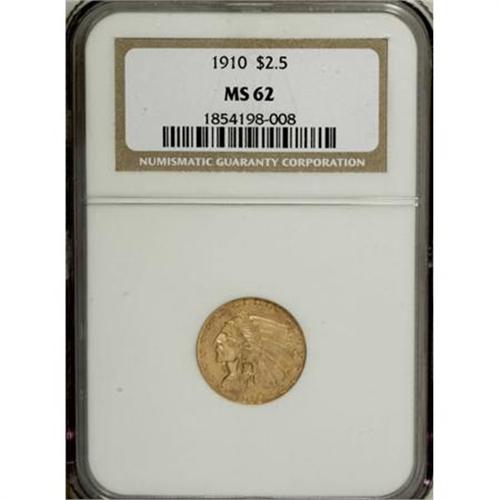 <B>1910 $2 1/2 MS62 NGC.</B></I> NGC Census: (1863/1478). PCGS Population (730/876). Mintage: 492,000. Numismedia Wsl. Price for NGC/PCGS coin in MS62: $540. (#7941)<BR><BR><B>Coin Engraver:</B> Bela Lyon Pratt<BR><BR><b>Shipping:</b> Coins & Currency (<a target="_blank" href="http://www.heritageauctions.com/common/shipping.php">view shipping information</a>\)