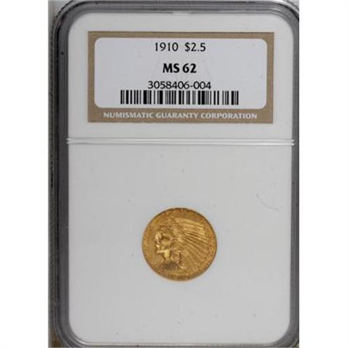 <B>1910 $2 1/2 MS62 NGC.</B></I> NGC Census: (1884/1510). PCGS Population (756/919). Mintage: 492,000. Numismedia Wsl. Price for NGC/PCGS coin in MS62: $540. (#7941)<BR><BR><B>Coin Engraver:</B> Bela Lyon Pratt<BR><BR><b>Shipping:</b> Coins & Currency (<a target="_blank" href="http://www.heritageauctions.com/common/shipping.php">view shipping information</a>)