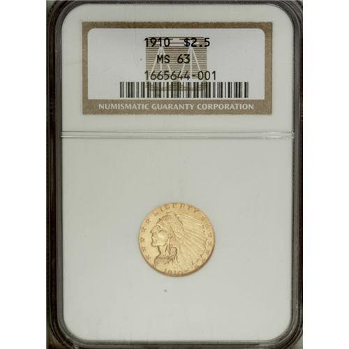 <B>1910 $2 1/2 MS63 NGC.</B></I> Brassy and suitably struck with a touch of green-violet in the hollow of the neck. Light abrasions in the obverse fields and on the cheek account for the grade.<BR><BR><b>Shipping:</b> Coin/Currency (<a target="_blank" href="http://www.heritageauctions.com/common/shipping.php">view shipping information</a>)