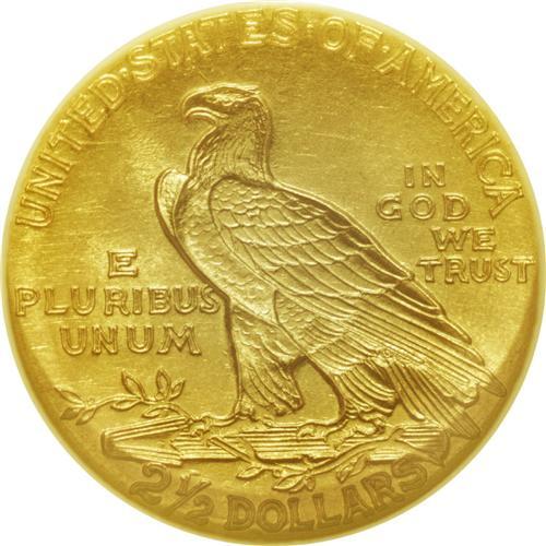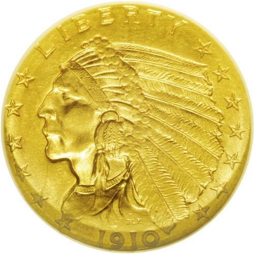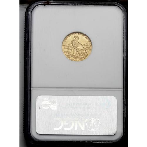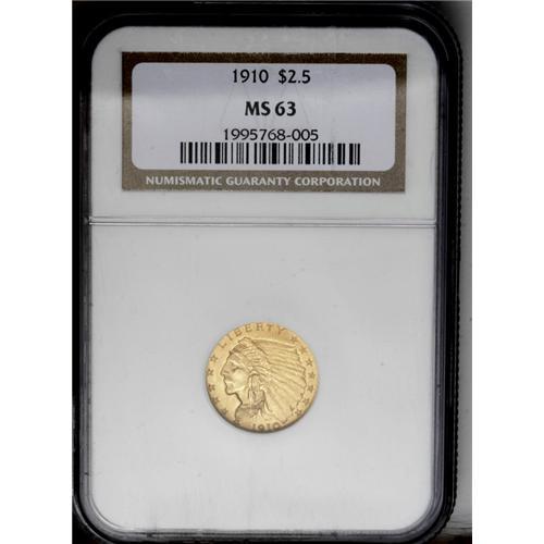 <B>1910<$2 1/2> MS63 NGC.</B></I> Honey-gold surfaces display satiny luster, and are characterized by well impressed design elements, as evidenced by crispness in the feathers of the headdress and in those of the eagle's breast and shoulder. Some wispy handling marks are noted in the raised exposed fields.