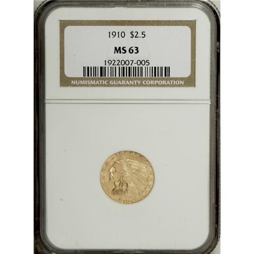 <B>1910 $2 1/2 MS63 NGC.</B></I> Select and suitably struck with a splash of orange on the otherwise apricot-gold surfaces. The fields and devices are surprisingly clean, though the luster is subtle.<BR><BR><b>Shipping:</b> Coin/Currency (<a target="_blank" href="http://www.heritageauctions.com/common/shipping.php">view shipping information</a>)