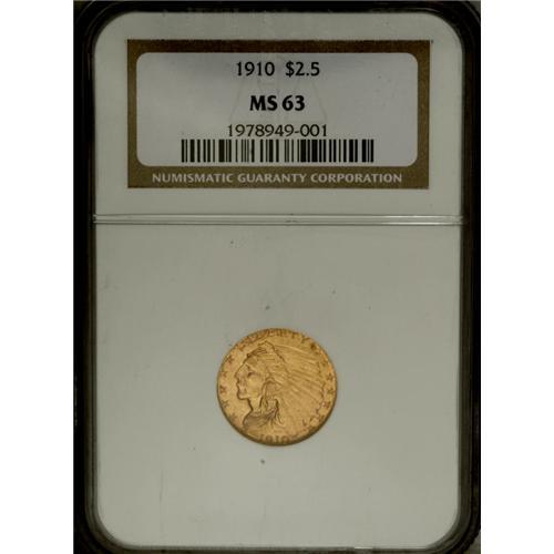 <B>1910 $2 1/2 MS63 NGC.</B></I> This well struck quarter eagle has softly lustrous orange-gold surfaces and patches of red near the upper obverse rims. The fields display a handful of light abrasions.<BR><BR><b>Shipping:</b> Coin/Currency (<a target="_blank" href="http://www.heritageauctions.com/common/shipping.php">view shipping information</a>)