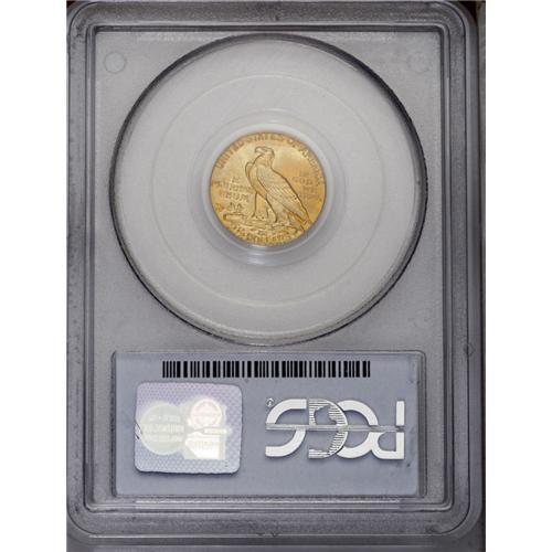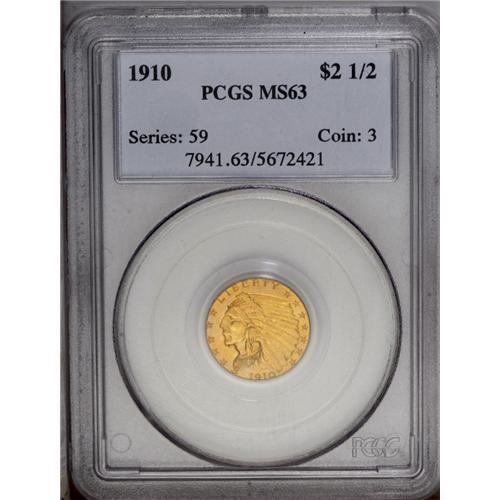 <B>1910 $2 1/2 MS63 PCGS.</B></I> Bright red-orange and light steel-green color greets the viewer of this sharply struck Mint State example. Nearly mark-free, with pleasing satin luster, this is a fine MS63 example of this early Indian quarter eagle issue.