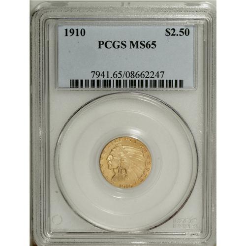 <B>1910 $2 1/2 MS63 PCGS.</B></I> This specimen displays attractive uniform frosted surfaces, sharp strike and enticing visual appeal.<BR><BR><b>Shipping:</b> Coin/Currency (<a target="_blank" href="http://www.heritageauctions.com/common/shipping.php">view shipping information</a>)