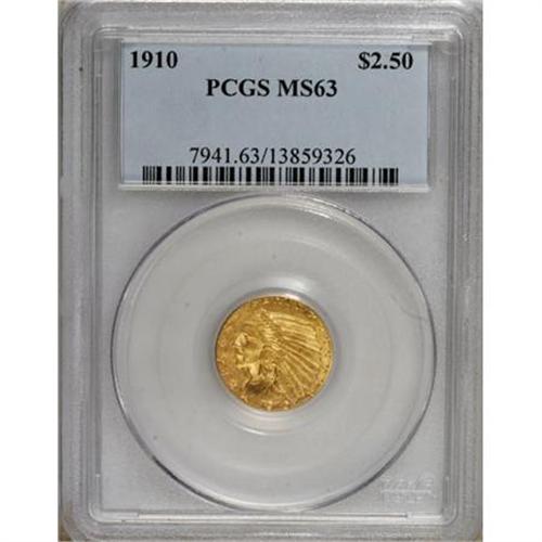 <B>1910 $2 1/2 MS63 PCGS.</B></I> PCGS Population (484/392). NGC Census: (931/547). Mintage: 492,000. Numismedia Wsl. Price for NGC/PCGS coin in MS63: $1,625. (#7941)<BR><BR><B>Coin Engraver:</B> Bela Lyon Pratt<BR><BR><b>Shipping:</b> Coins & Currency (<a target="_blank" href="http://www.heritageauctions.com/common/shipping.php">view shipping information</a>\)