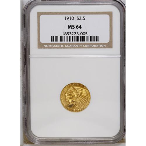 <B>1910 $2 1/2 MS64 NGC.</B></I> A remarkably clean and well struck example of this popular, third year of issue for the Indian quarter eagle. The surfaces show few of the abrasions that Pratt's reduced relief is so well known for. Soft, satiny mint luster is overlaid with even orange-gold coloration.<BR><BR><b>Shipping:</b> Coin/Currency (<a target="_blank" href="http://www.heritageauctions.com/common/shipping.php">view shipping information</a>)