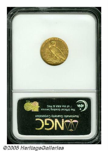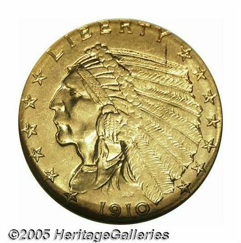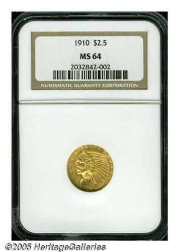 <B>1910<$2 1/2> MS64 NGC.</B></I> Brilliant and frosty. The striking quality is typical for many Indian Head quarter eagles, showing some softness of definition on some of the lower feathers in the Indian's war bonnet. A faint line in the field behind the eagle's head and neck was probably the only reason that NGC didn't assign the MS65 classification. Scarce and desirable this nicely preserved.<BR><I>From the Dr. Kurt Peters Collection.</B></I> From the Dr. Kurt Peters Collection.