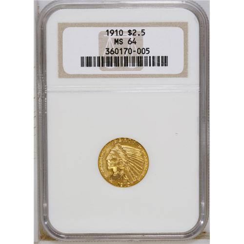 <B>1910 $2 1/2 MS64 NGC.</B></I> Exquisitely struck motifs embolden both sides of this gorgeous quarter eagle. Lustrous with lovely peach-gold patina, and no significant marks.<BR><BR><b>Shipping:</b> Coin/Currency (<a target="_blank" href="http://www.heritageauctions.com/common/shipping.php">view shipping information</a>)