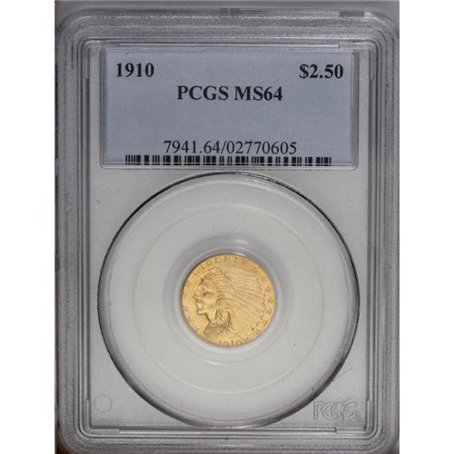 <B>1910 $2 1/2 MS64 PCGS.</B></I> A lovely near-Gem example with lustrous and frosty yellow gold surfaces and sharp design elements. A few light abrasions are consistent with the grade and keep this below the Gem grade level. An exciting example. Population: 272 in 64, 67 finer (1/06).