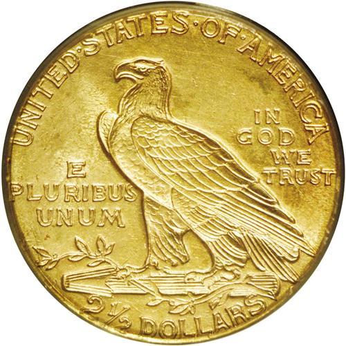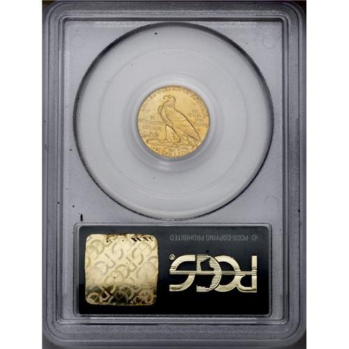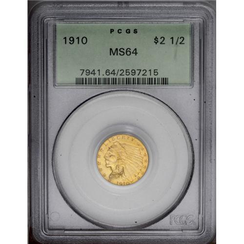 <B>1910<$2 1/2> MS64 PCGS.</B></I> A radiant peach-gold near-Gem. Undisturbed fields and devices ensure the eye appeal. The lowest two headdress feathers have a couple of incompletely impressed areas, but the strike is otherwise exemplary. All quarter eagles from the teens are coveted in better Mint State grades. Encapsulated in a green label holder.<BR><I>From The Sandia Mountain Collection.</B></I>