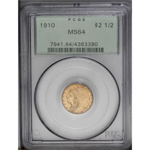 <B>1910 $2 1/2 MS64 PCGS.</B></I> A well struck orange-gold example that has copper-stained zones of red and violet on each side. Softly lustrous with light marks near the Indian's mouth.<BR><BR><b>Shipping:</b> Coin/Currency (<a target="_blank" href="http://www.heritageauctions.com/common/shipping.php">view shipping information</a>)