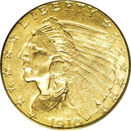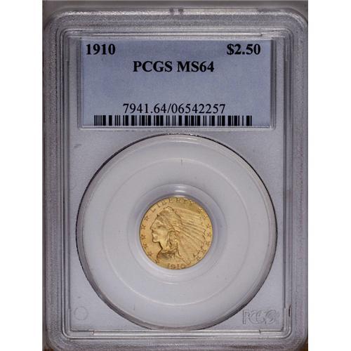 <B>1910<$2 1/2> MS64 PCGS.</B></I> Each side imparts a green-gold appearance with orange-gold color in some if the protected areas. A well struck near-Gem, a few small marks surrounding the eagle's head on the reverse seem to limit the grade. A delightful, original type coin.