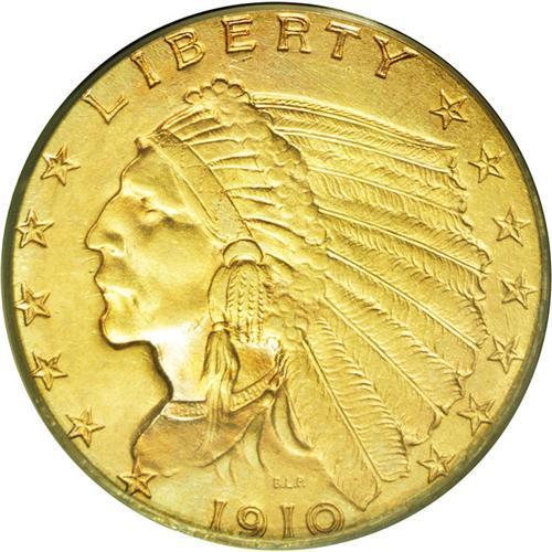 <B>1910<$2 1/2> MS64 PCGS.</B></I> The lush, rich surfaces are deeply patinated in hazel-gray and deep sunset-gold on both sides. There is a small patch of light, parallel scrapes just above the headdress, but the cheek and the fields before the portrait are pristine and quite appealing. For color collectors, this piece would make a good beginning or addition to a type set.