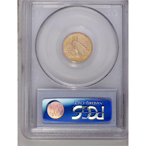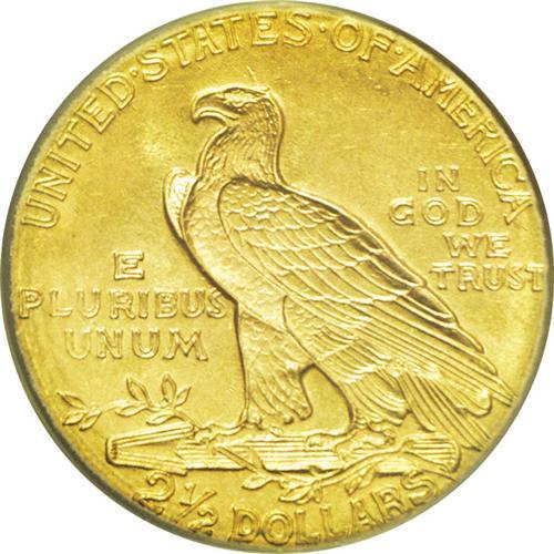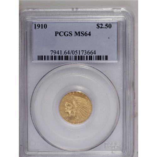<B>1910<$2 1/2> MS64 PCGS.</B></I> This piece has many of the hallmarks of this issue, among them granular surfaces and slight striking weakness in the center. As an orange-gold coin with green accents, though, it deviates from the norm. Only a few tiny marks appear on the Indian's cheek and in the fields.