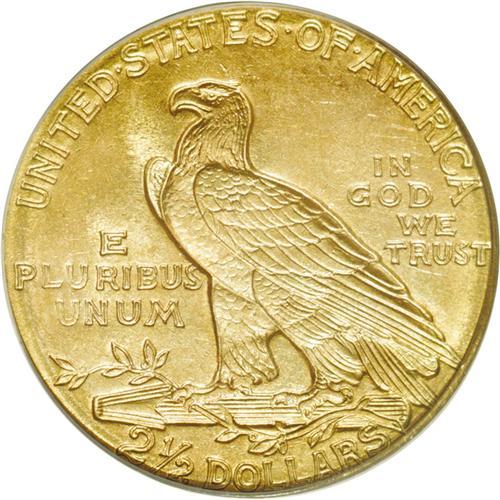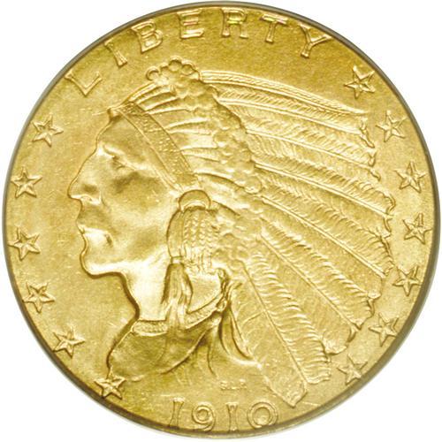 <B>1910<$2 1/2> MS64 PCGS.</B></I> This well preserved and lovely coin has tinges of hazel-blue on the central devices that complement the overall reddish-orange coloration. The luster is soft and appealing. A couple of ticks on the Indian's cheek prevent a Gem designation, but much eye appeal is present.