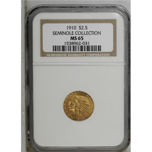 <B>1910 $2 1/2 MS65 NGC.</B></I> Like many of the Philadelphia issues in this short and very collectible series, the 1910 is a date that is relatively available in all grades, until one surpasses the MS64 level. The surfaces on this desirable Gem display a softly frosted sheen and precious few disturbances under splashes of delicate orange and steel-green patina. Census: 91 in 65, 7 finer (10/06).<BR><BR><b>Shipping:</b> Coin/Currency (<a target="_blank" href="http://www.heritageauctions.com/common/shipping.php">view shipping information</a>)