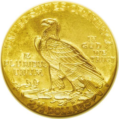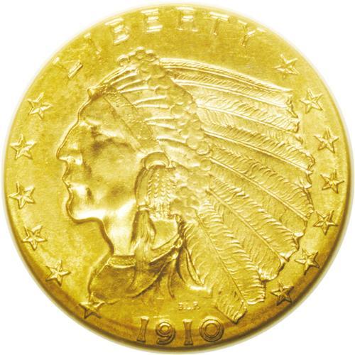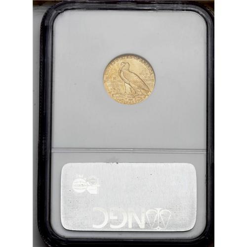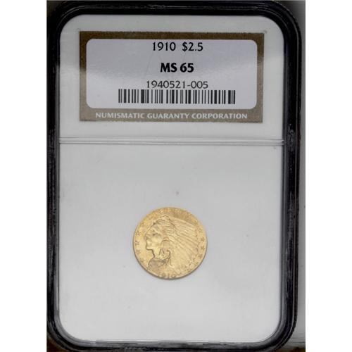 <B>1910<$2 1/2> MS65 NGC.</B></I> With an NGC population of 86 coins at this grade level, it seems that this issue should be available on a fairly regular basis, however, the last time we offered a Gem example was January 2005, and just 11 such coins have appeared in our auctions over the past 13 years. Fully struck and highly lustrous with impressive orange-gold color and faint blue highlights. Census: 86 in 65, 7 finer (6/06).