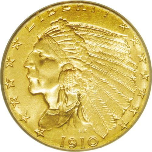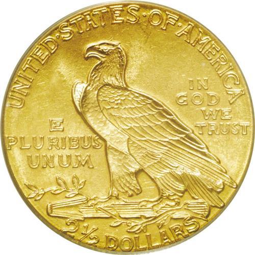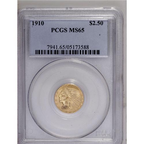 <B>1910<$2 1/2> MS65 PCGS.</B></I> Rich orange toning graces the reverse, while the portrait and obverse field display lighter apricot and olive coloration. Even evaluation beneath a loupe fails to locate relevant contact, and the undulating luster further propels the eye appeal. Population: 63 in 65, 6 finer (6/06).