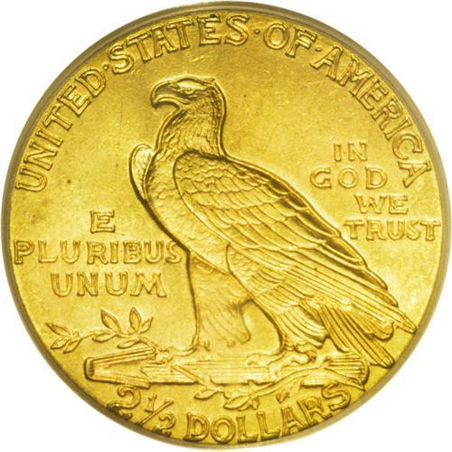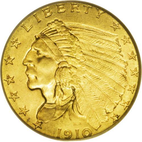 <B>1910<$2 1/2> MS65 PCGS.</B></I> This gently shimmering Gem is beautifully void of marks, and the strike is impressive despite a hint of incompleteness within the lower headdress feathers. The open fields for the Indian quarter eagle type are usually a magnet for myriad small marks. The present piece, however, provides an exception. Population: 67 in 65, 6 finer (9/06).