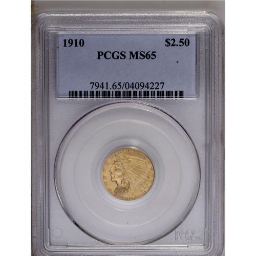 <B>1910 $2 1/2 MS65 PCGS.</B></I> This gently shimmering Gem is beautifully void of marks, and the strike is impressive despite a hint of incompleteness within the lower headdress feathers. The open fields for the Indian quarter eagle type are usually a magnet for myriad small marks. The present piece, however, provides an exception. Population: 69 in 65, 6 finer (12/06).<BR><BR><b>Shipping:</b> Coin/Currency (<a target="_blank" href="http://www.heritageauctions.com/common/shipping.php">view shipping information</a>)