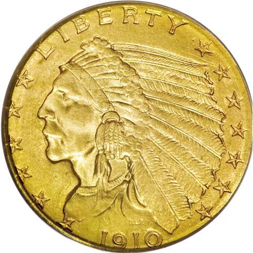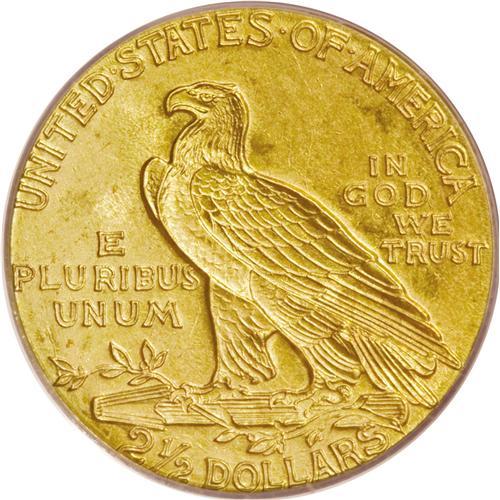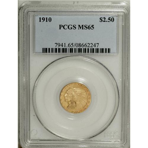 <B>1910 $2 1/2 MS65 PCGS.</B></I> Though Pratt made a daring artistic statement with his incused depiction of Chief Thundercloud and the eagle, the grading services have taken a dim view of the exposed, vulnerable fields of his design. Gems are few and far between for the earlier issue from 1908 to 1915, yet here one is. The orange-gold surfaces are frosty, particularly on the reverse, and exceptionally well-preserved. Above-average design definition rounds out the whole. Population: 68 in 65, 6 finer (11/06).<BR><BR><b>Shipping:</b> Coin/Currency (<a target="_blank" href="http://www.heritageauctions.com/common/shipping.php">view shipping information</a>)