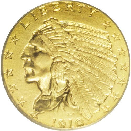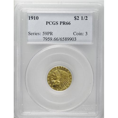 <B>1910 $2 1/2 PR66 PCGS.</B></I> The 1910 issue continues the Roman Gold or Satin Finish proofing process for gold proofs as begun the previous year. The official mintage for this issue was 682 pieces. This number is obviously either a typographical error in the mint report or most of the mintage was melted as unsold at year's end, as this year is one of the scarcer dates in the series, only exceeded in rarity by the 1909 and 1915. One estimate places the number of survivors in the range of 34-36 pieces, but that number may be a bit low. We estimate 100-125 may actually be extant. Akers only recorded 21 appearances in the 30-year survey he conducted, and that number obviously included several duplications. The surfaces of this piece are satiny and show a fine-grain texture that is quite unlike other proof years, making proof gold coins from this and the preceding year one of the shortest and certainly most desirable collecting areas for 20th century gold specialists. A slight reddish tinge is seen in the recessed areas and appealing olive patina frames each side. Most proof Indian quarter eagle dates exhibit dull, dark matte surfaces. Collector complaints about this matte finish, well documented in Roger Burdette's recent reference on the gold designs of 1907 and 1908, resulted in the Roman finish, which is brighter and less granular. The nature of the Saint-Gaudens and Bela Lyon Pratt designs kept the mint from offering them with the brilliant finish familiar on Liberty gold proofs. Population: 6 in 66, 0 finer (10/06).<BR><BR><b>Shipping:</b> Coin/Currency (<a target="_blank" href="http://www.heritageauctions.com/common/shipping.php">view shipping information</a>)